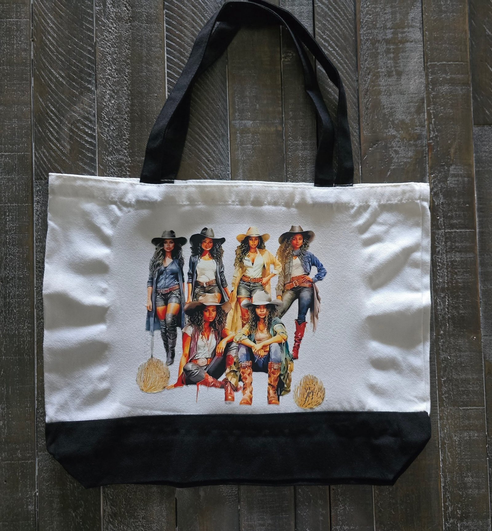 Ride into your day with bold style and undeniable attitude with this Black Cowgirl Squad Canvas Tote Bag. Featuring a powerful illustration of stunning Black women in chic cowgirl fits—complete with hats, boots, and boss energy—this tote is a celebration of culture, confidence, and western fashion. The contrast of black handles and base adds a sleek touch to the eye-catching design.
