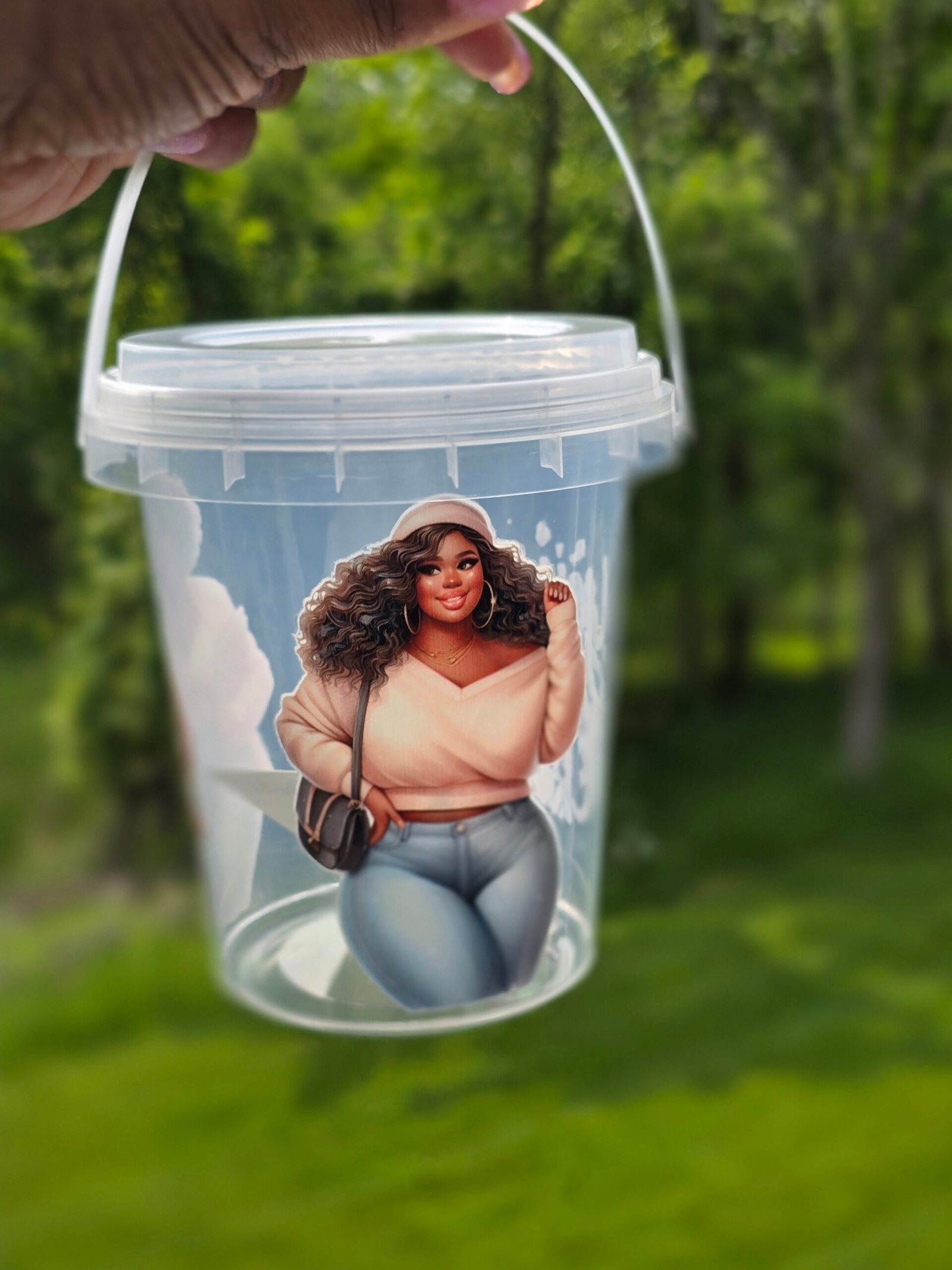 Turn heads and stay refreshed with our Curvy Girl Reusable Beverage Bucket! Featuring a stunning, confident curvy girl illustration, this clear drink bucket adds personality and attitude to your favorite beverages.
