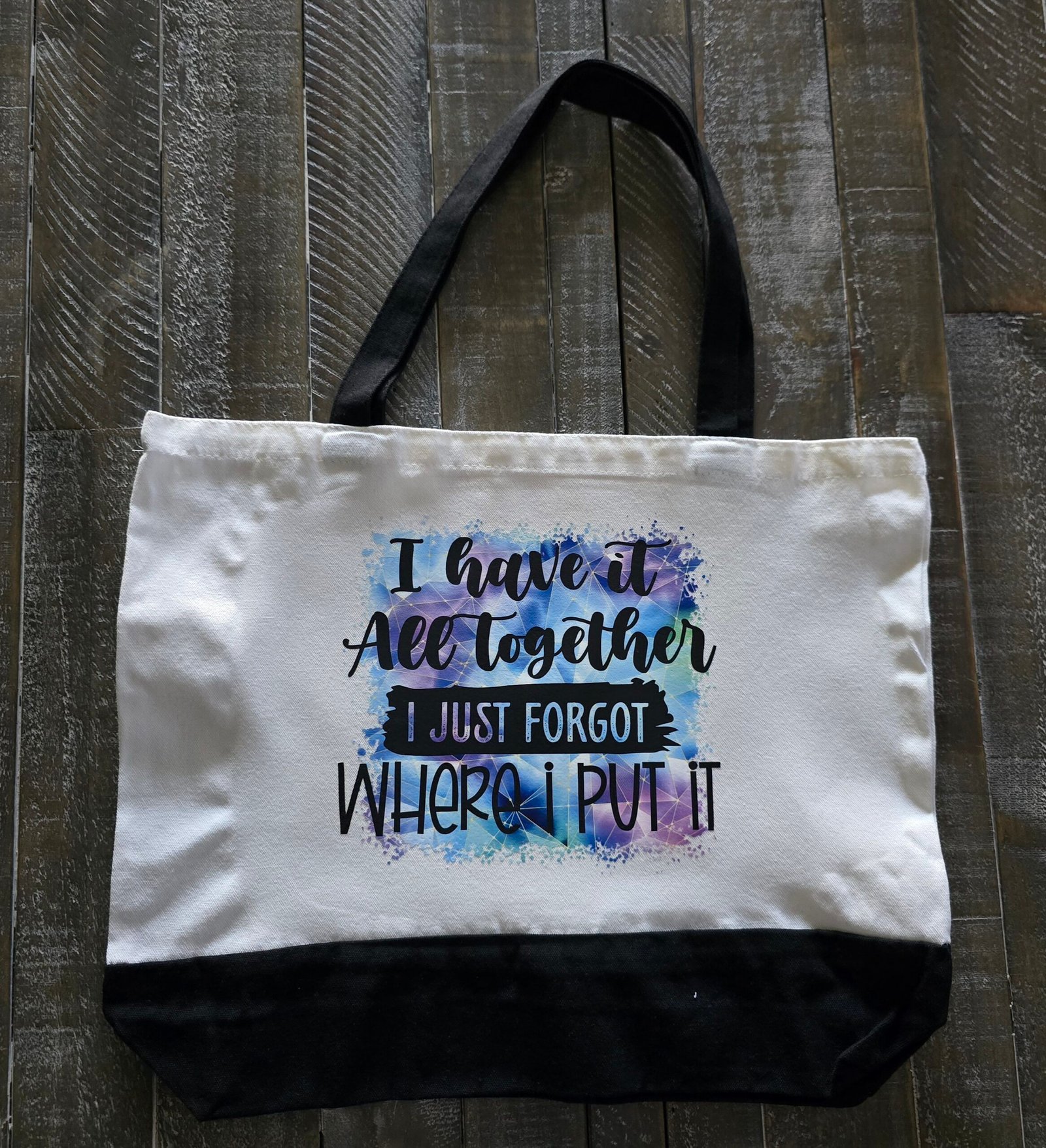 For those days when you’re totally put together… or at least pretending to be—this hilarious “I Have It All Together (I Just Forgot Where I Put It)” Tote Bag is your perfect sidekick. With its watercolor-style background and witty typography, this bag adds personality and humor to any outfit. The sturdy black bottom and handles offer a sleek, durable finish, ideal for daily use.