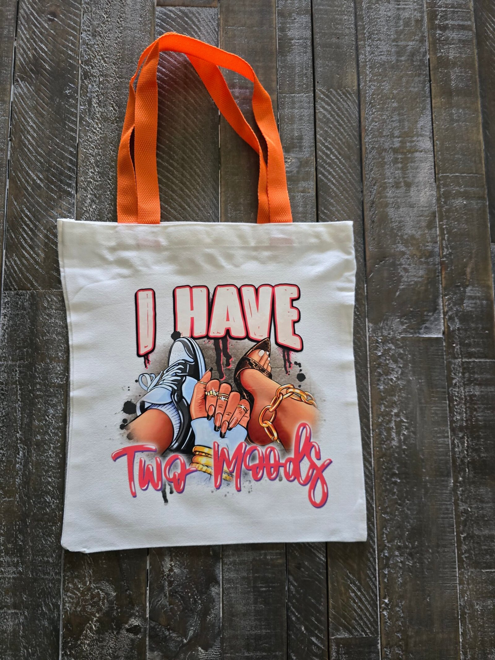 Show off your style and personality with this statement-making “I Have Two Moods” Canvas Tote Bag. Featuring a bold graphic of two contrasting looks—laid-back in sneakers and glam in gold chains and heels—this tote perfectly captures your dual energy. Made with durable canvas and bright orange handles for a pop of color, it’s your new go-to bag for errands, beach days, shopping, or brunch with the girls.
