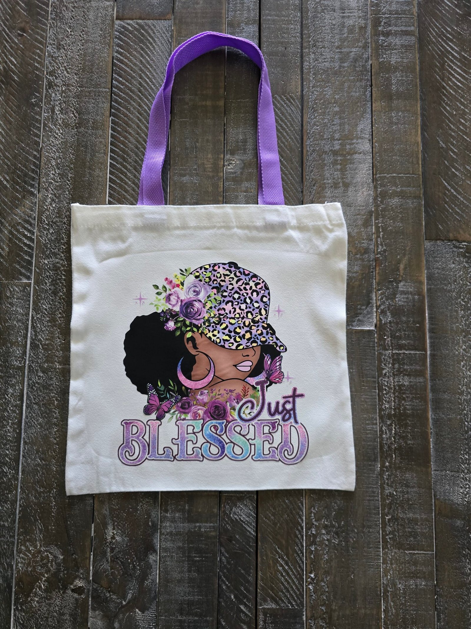 Carry your confidence wherever you go with this vibrant “Just Blessed” Canvas Tote Bag! Featuring a stunning graphic of an African American woman adorned with floral accents, bold hoops, and a glitter-style cap, this tote blends empowerment with everyday style. Made from durable cotton canvas and finished with purple handles, it’s perfect for the beach, shopping, errands, or gifting.