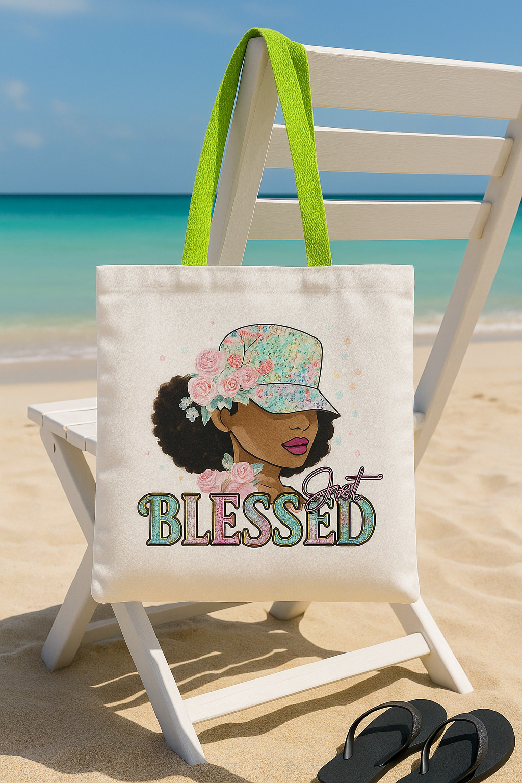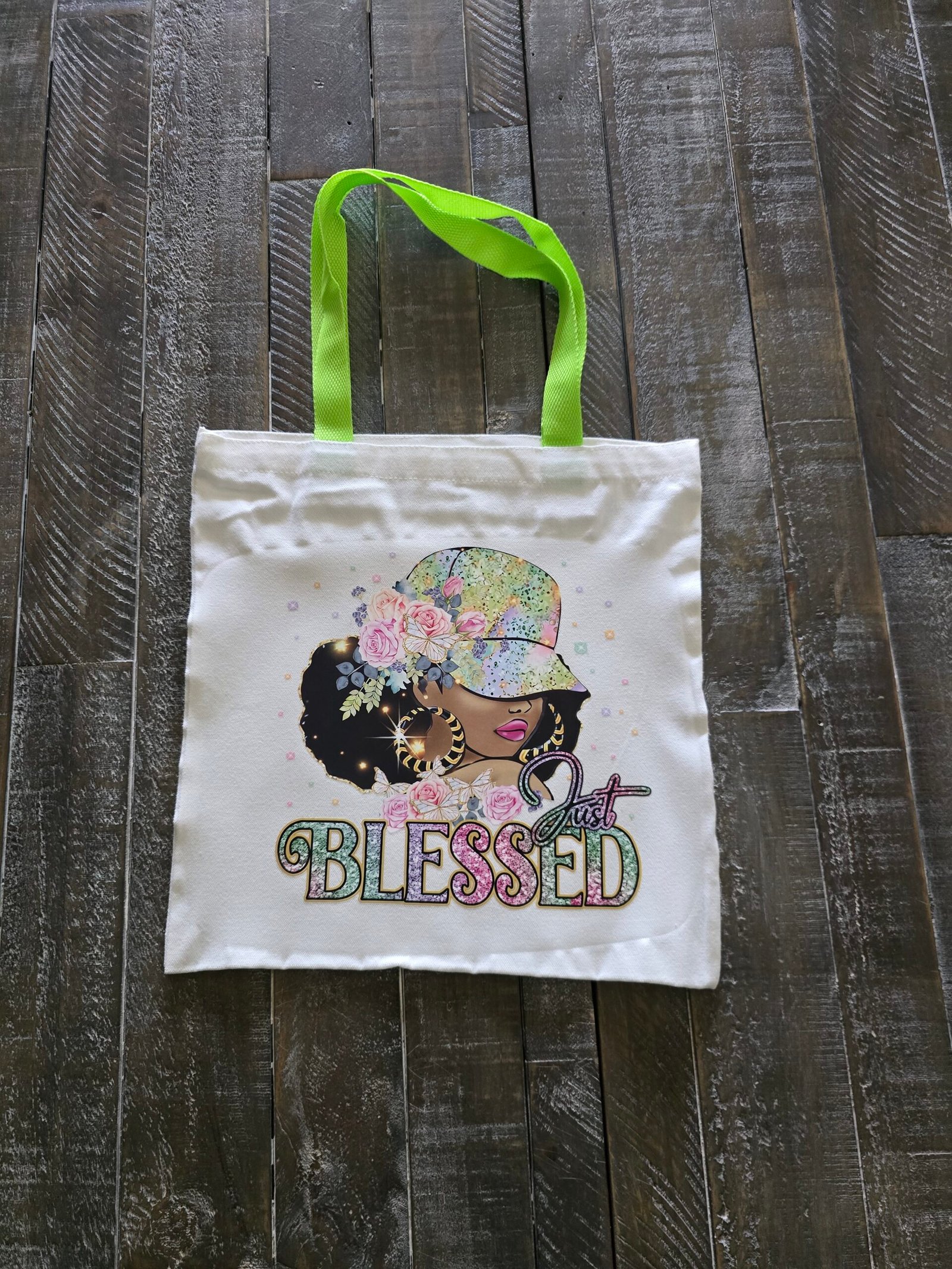 Carry your confidence wherever you go with this vibrant “Just Blessed” Canvas Tote Bag! Featuring a stunning graphic of an African American woman adorned with floral accents, bold hoops, and a glitter-style cap, this tote blends empowerment with everyday style. Made from durable cotton canvas and finished with bold neon green handles, it’s perfect for the beach, shopping, errands, or gifting.