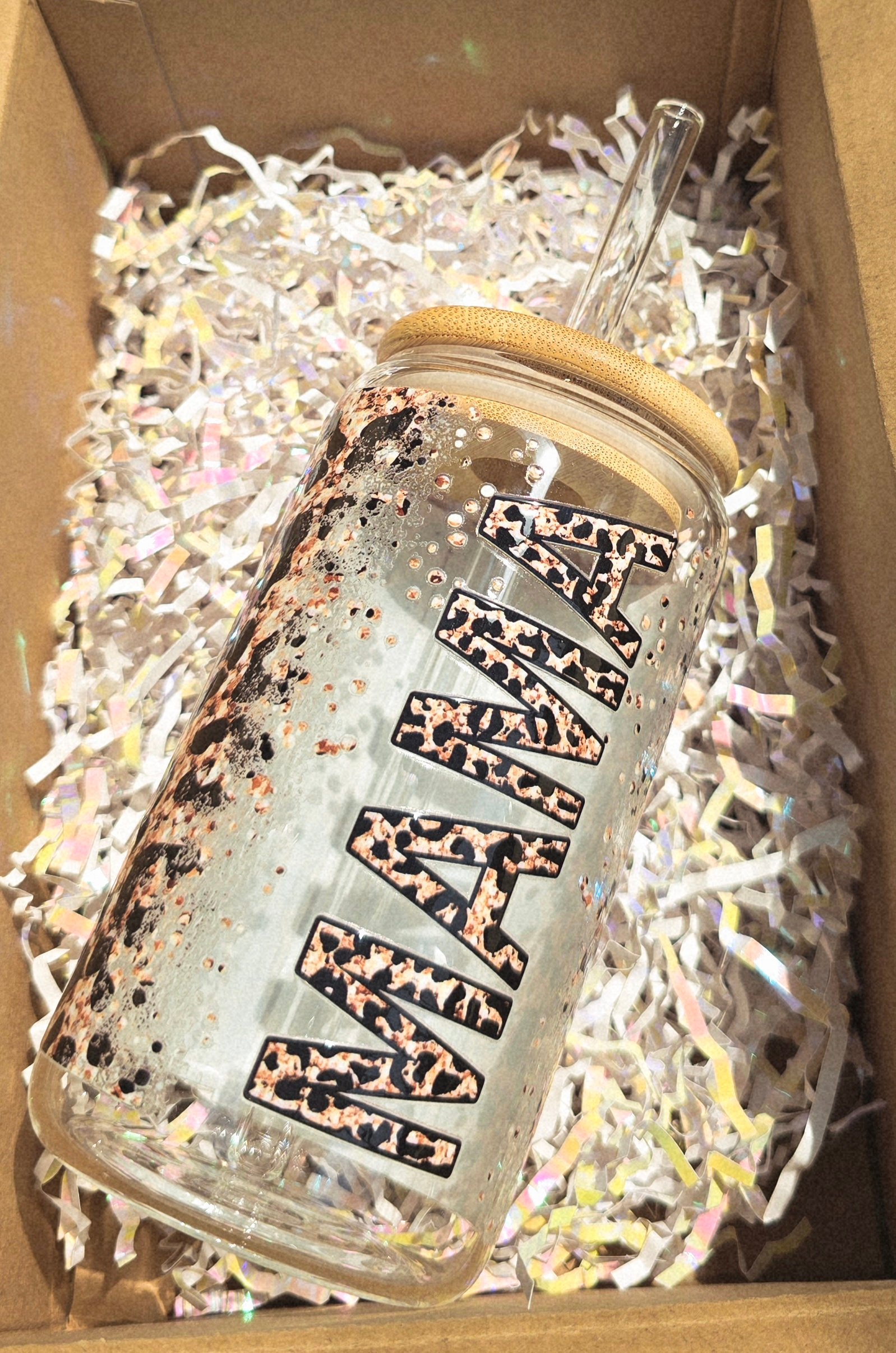 Celebrate the bold spirit of motherhood with our Leopard Print “MAMA” Glass Tumbler! This 16oz glass cup features a fierce leopard print “MAMA” design, making it the perfect statement piece for moms who love their coffee as strong as their hustle. The textured splatter effect adds a trendy twist, while the bamboo lid and glass straw keep your sipping eco-friendly and stylish.