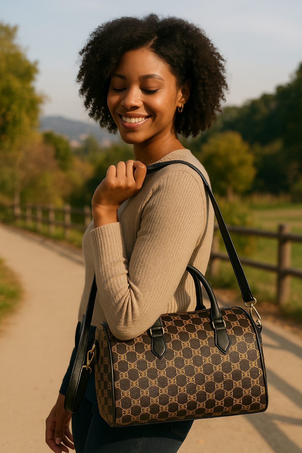 Step out in confidence with the Luxury-Inspired Black & Gold Barrel Satchel, a chic, structured handbag that radiates sophistication. Designed with a classic barrel silhouette, this purse features a luxe black base adorned with a gold geometric pattern that exudes designer vibes without the designer price. Equipped with top handles and a detachable crossbody strap, it’s perfect for effortless day-to-night transitions. Whether you’re heading to brunch, a business meeting, or a night out, this bag brings style and polish to any outfit.